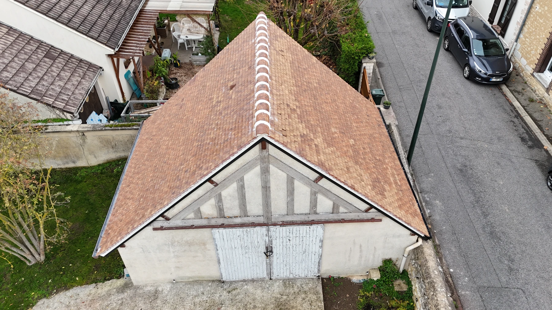 Nous venons de mener à bien la rénovation complète d’un garage en pose de tuiles plates Éminence « Longchamp », une vraie tuile en terre cuite, fabriquée en France.